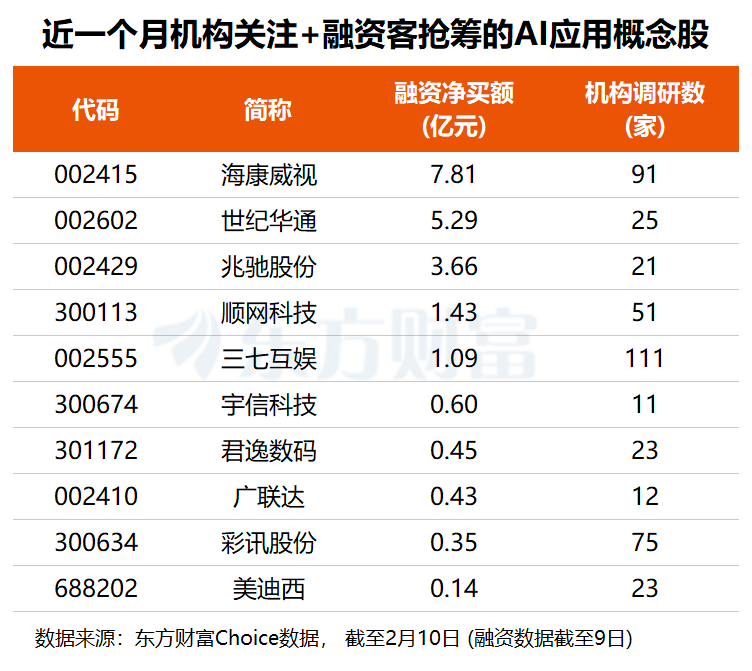 值得一提的是,上述 23 只机构关注的 AI 应用概念股中,有多股同时获得杠杆资金的青睐。海康威视获融资客大举抢筹 7.81 亿元,世纪华通、兆驰股份融资净买额分别为 5.29 亿元、3.66 亿元,顺网科技、三七互娱也获超 1 亿元融资净买入。