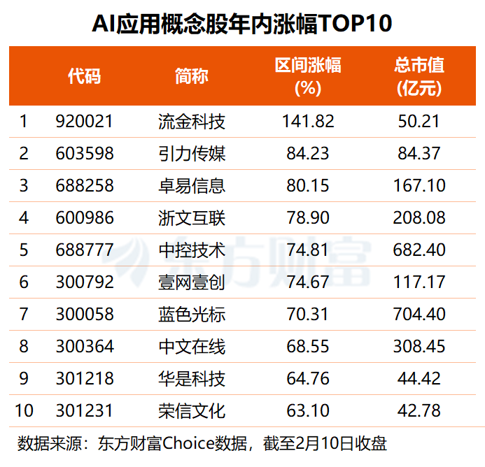 今年以来,约八成 AI 应用概念股录得股价上涨,北交所上市公司流金科技大涨 1.4 倍居首,引力传媒、卓易信息区间涨幅均超 80%,浙文互联、蓝色光标、捷成股份等 12 股涨幅均在五成以上。