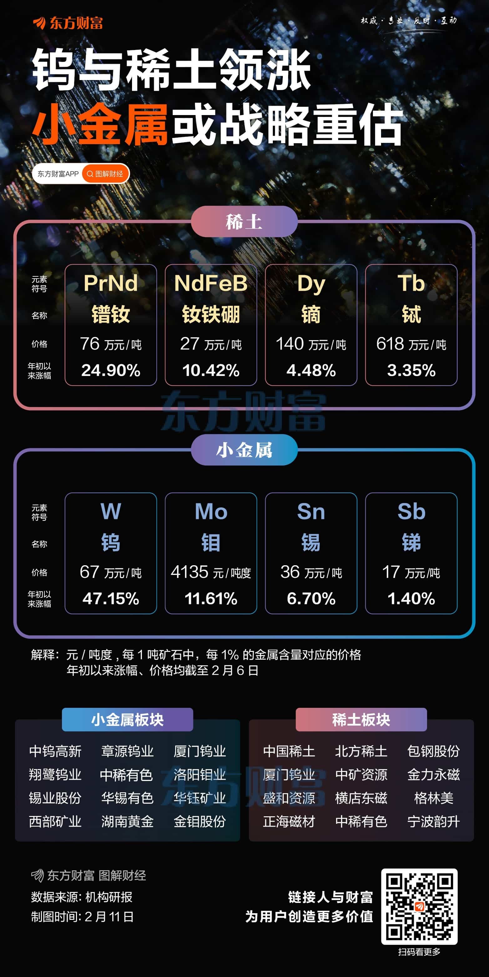长城证券表示,战略金属价值重估进行时,维持小金属板块 「强于大市」 评级。跟着战略金属政策走,首选稀土、钨板块。稀土:政策端出口管制加码,短期有望推动稀土价格继续上行,供给约束下长期需求 (新能源、风电、机器人) 向好,板块中长期趋势明确。钨:供需偏紧叠加战略金属惜售情绪不断升温,推动钨价持续上涨。