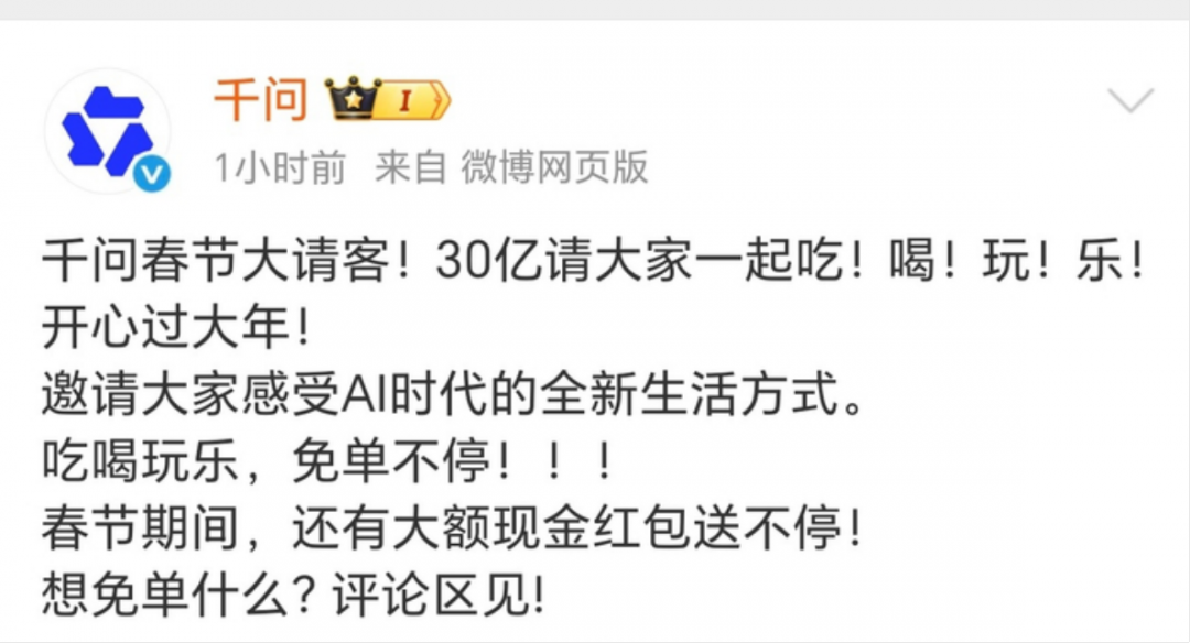 阿里也同样选择向用户生活场景出击,旗下千问 AI 启动了 「春节 30 亿免单」 活动,通过发放大额红包,激励用户通过千问调用淘宝闪购、飞猪等阿里系应用,比如叫外卖、订酒店等。