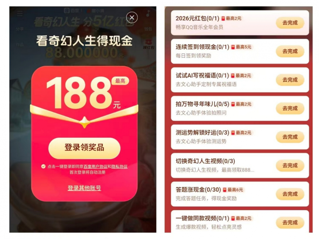 百度也有类似的烦恼。过往,百度在互联网大厂中一直略显低调,这一次却紧随着腾讯元宝宣布推 5 亿元红包活动,用户在百度搜索 「春节红包」,即可参与 AI 特效互动、集卡分奖金。