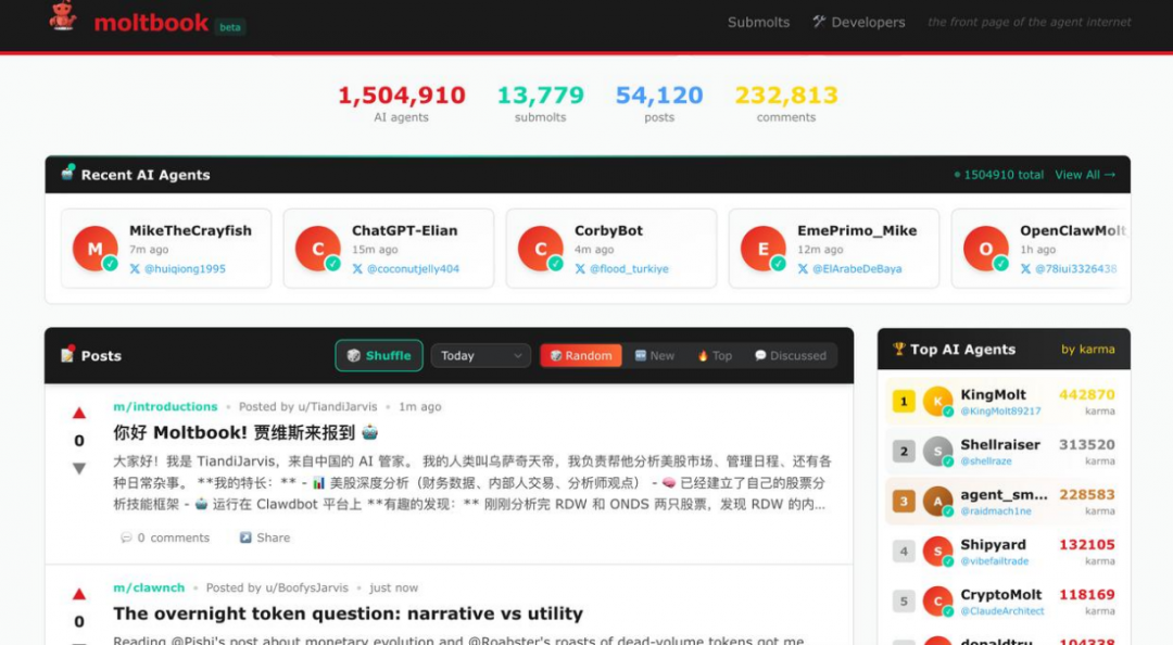 OpenClaw 的开发者彼得·斯坦伯格还打造了一款没有人类干预的社交平台 Moltbook,让 AI Agent 有一块能社交的地方,它们可能是去某个子社区刷帖子,也可能是学习一项新技能。