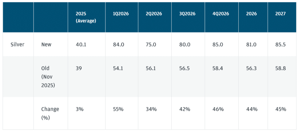 摩根大通全球研究预测,2026 年白银平均价格为每盎司 81 美元,预计第四季度平均价格最高,达 85 美元;同时该机构预测,2027 年这种灰白色金属的平均价格为 85 美元。