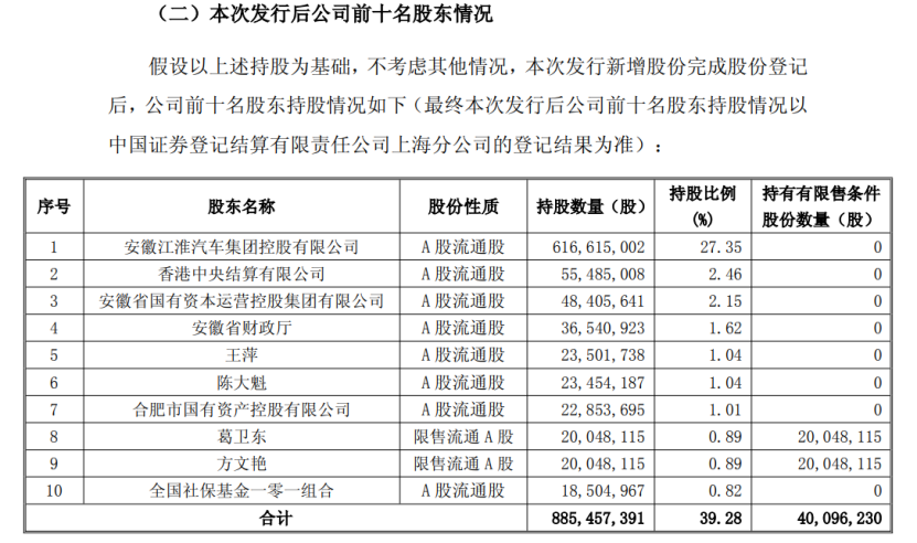 至此,葛卫东、章建平的妻子方文艳将并列为江淮汽车第 8 大股东。