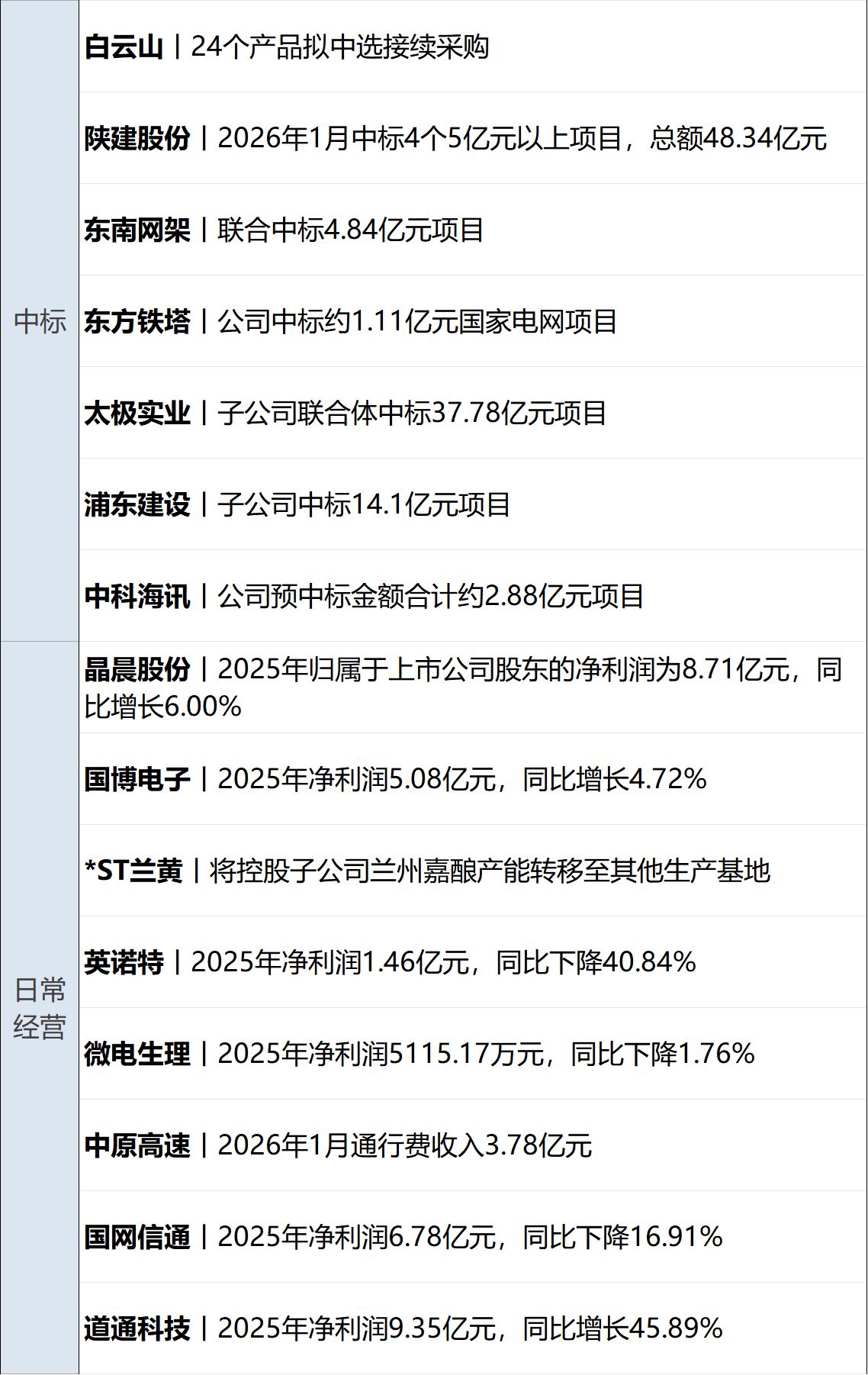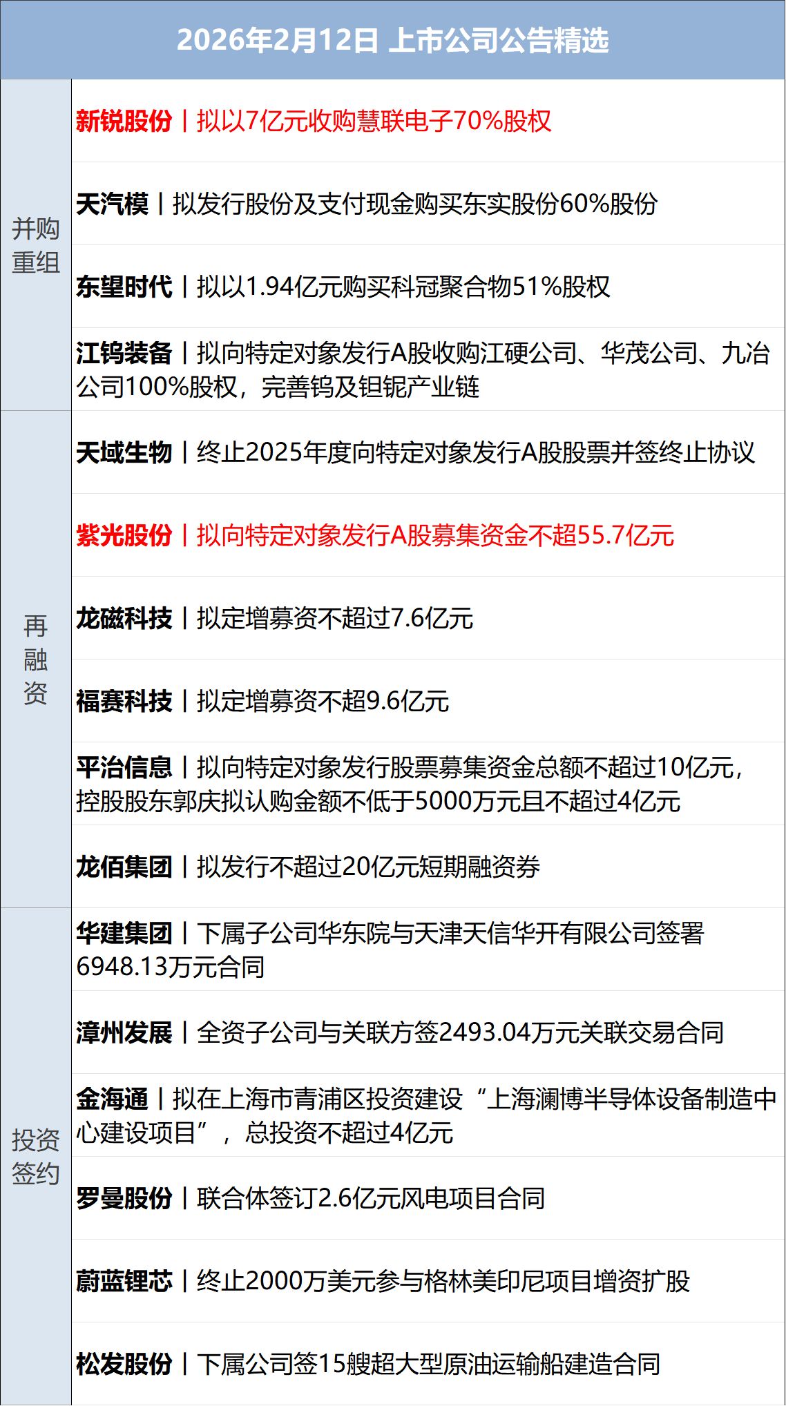 闻泰科技 (SH600745,股价 35.23 元,市值 438.49 亿元):2 月 11 日,闻泰科技披露子公司经营管理情况的进展公告称,就前述 2026 年 1 月 14 日听证和核心议题,企业法庭于荷兰时间 2026 年 2 月 11 日做出裁决。企业法庭经审理后,批准了启动正式调查的申请,并将调查范围扩大至安世半导体当地管理层的行为,并裁定此前颁布的所有临时措施,包括对特定人员职务及股东权利的限制,在调查期间继续维持效力,但股权托管人在调查期间不能处置股权。企业法庭的此次裁决维持了 2025 年 10 月以来对安世采取的临时措施,企业法庭开展调查期间,公司对安世的控制权仍然处于受限状态。