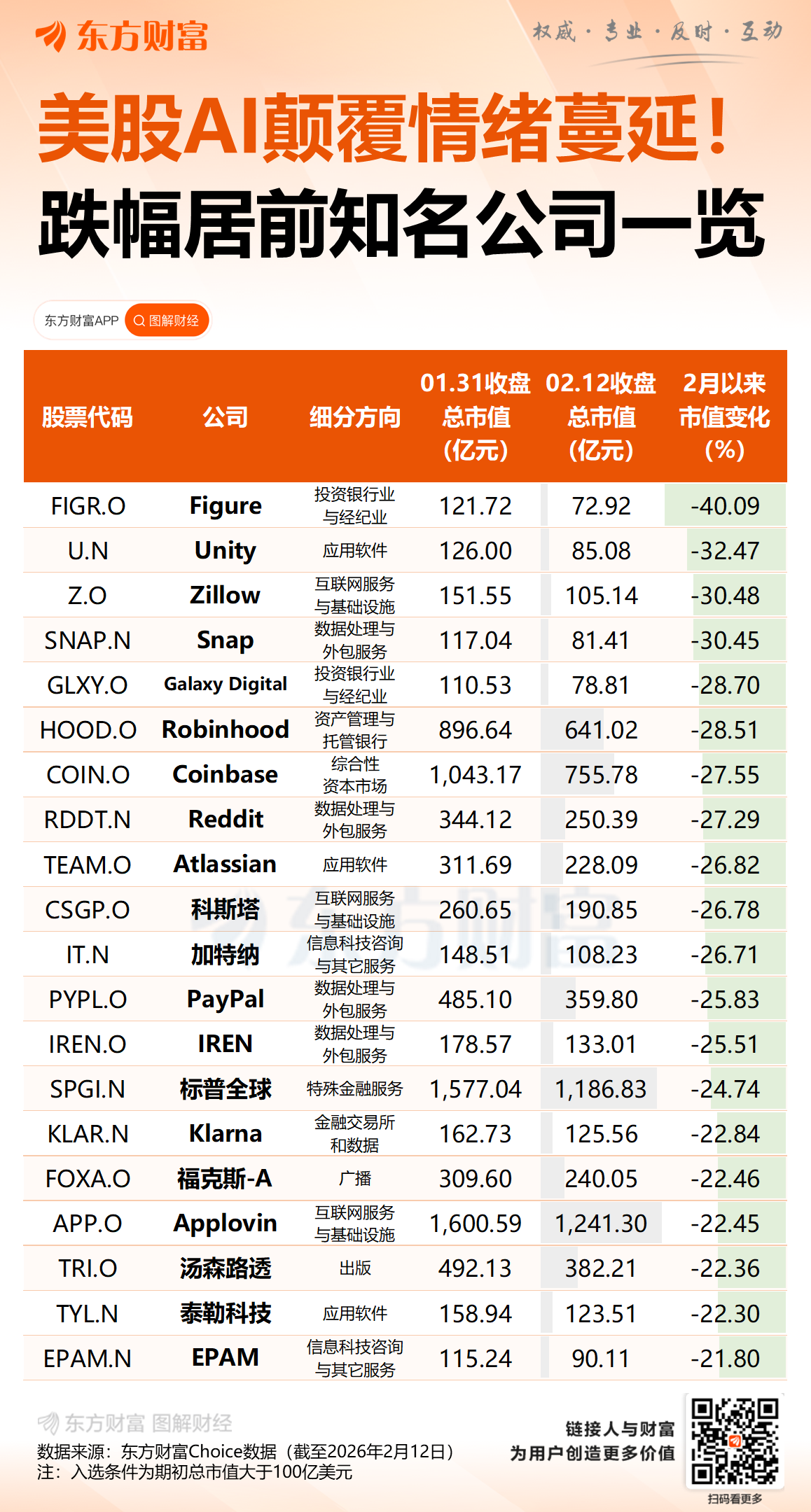 AI 颠覆担忧还蔓延至房地产行业,市场认为更高的失业率将打击办公空间需求,世邦魏理仕(CBRE) 一度暴跌超 15%,最终收跌 8.84%;SL Green Realty 大跌近 5%。
