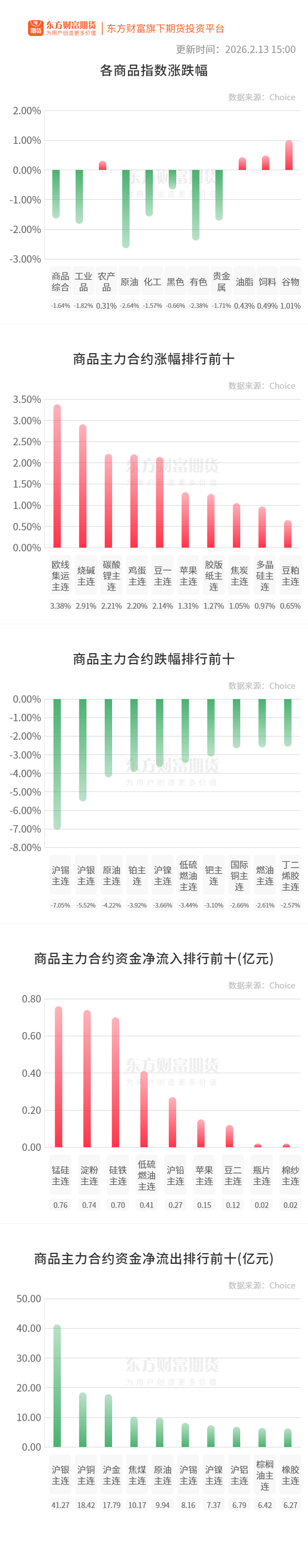 工业硅:2 月 13 日,华东不通氧 553#在 9100-9300 元/吨;通氧 553#在 9200-9400 元/吨;521#在 9300-9500 元/吨;441#在 9300-9600 元/吨;421#在 9500-9800 元/吨;421#有机硅用在 9800-10200 元/吨;3303#在 10200-10400 元/吨。昆明、黄埔港、天津、西北、上海、新疆、四川地区硅价持稳。97 硅今日价格持稳。(SMM)