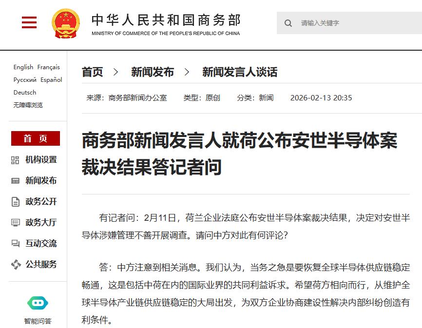 商务部新闻发言人就荷兰公布安世半导体案裁决结果答问