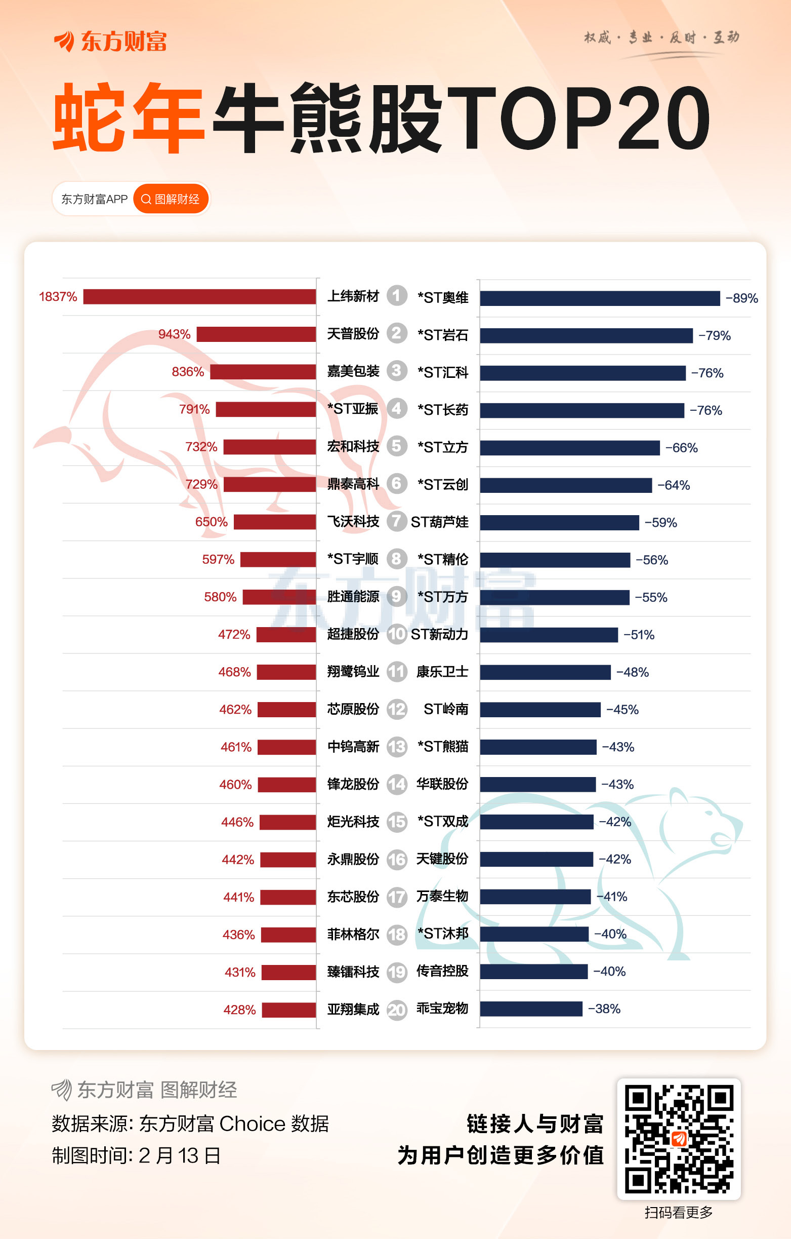 乙巳蛇年 A 股交易收官,「双春年」(一年两个立春) 的祥瑞之兆得到印证,这一年成为近 11 个生肖年中表现最好的一年。截至 2 月 13 日收盘,上证指数全年涨 25.58%,深证成指涨 38.84%,创业板指涨 58.73%。