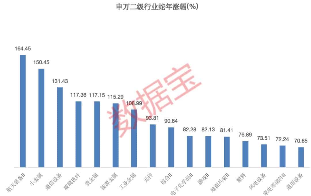 以申万二级行业划分,航天装备Ⅱ、小金属指数年涨幅居前,依次为 164.45%、150.45%;通信设备、玻璃玻纤、贵金属、能源金属等指数紧随其后,年涨幅均在 100% 以上。