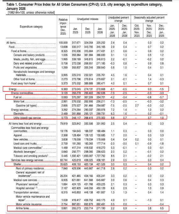 当地时间周五 (13 日),美国劳工统计局 (BLS) 公布,1 月 CPI 环比上涨 0.2%,低于去年 12 月未修正的 0.3% 涨幅。CPI 年率从 2.7% 回落至 2.4%,创 2025 年 5 月以来新低,市场预期中值 2.5%。1 月未季调核心 CPI 环比上涨 0.3%,符合预期,较 12 月的 0.2% 小幅回升。年率从 2.6% 回落至 2.5%,创 2021 年 3 月以来新低,符合市场预期。核心 CPI 上升部分源于年初一次性涨价,劳工统计局用于剔除季节性波动的季节调整模型,尚未完全覆盖此类一次性调价影响。