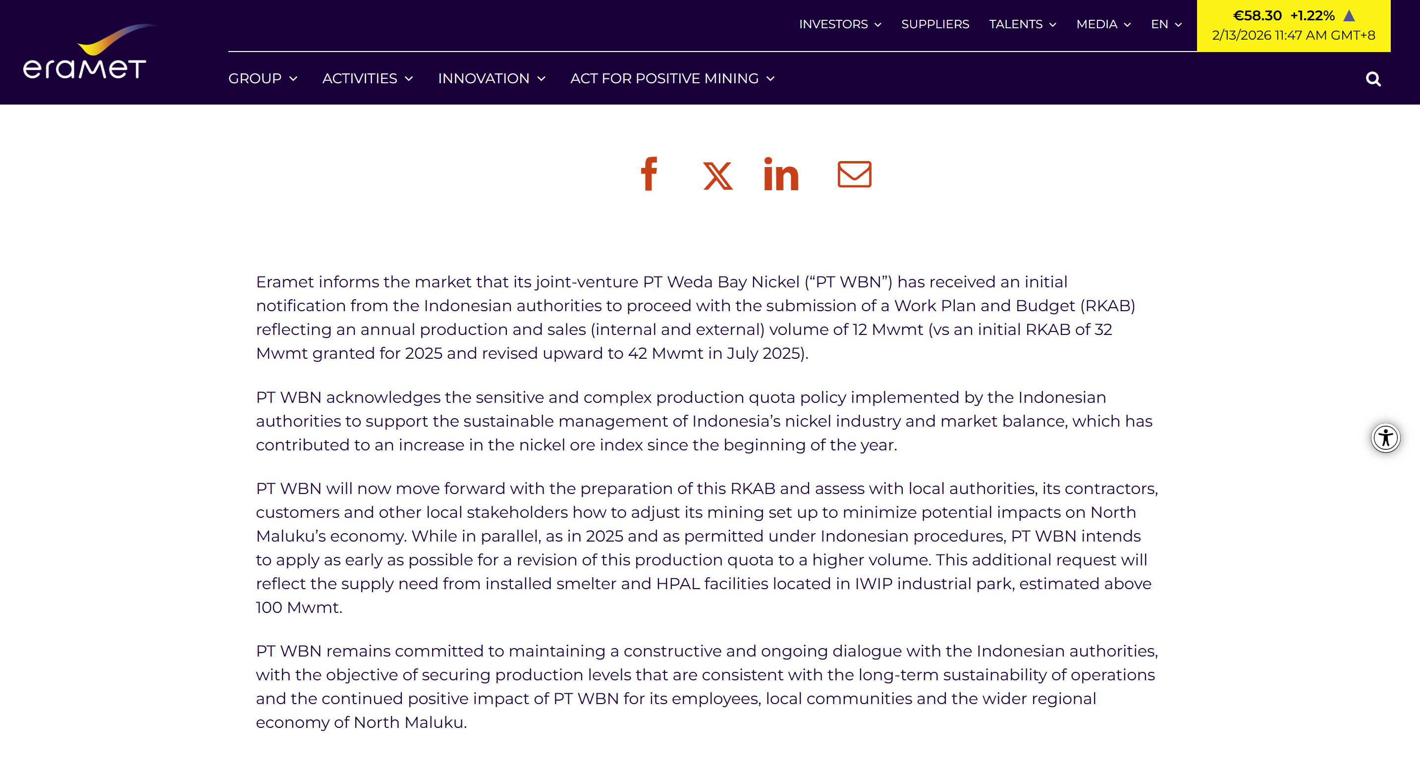 韦达湾镍矿由青山控股、埃赫曼集团和印尼国企 PT Aneka Tambang 合资所有。埃赫曼集团称,与 2025 年的做法一致,在印尼相关程序允许范围内,韦达湾镍矿计划尽早申请上调生产配额。