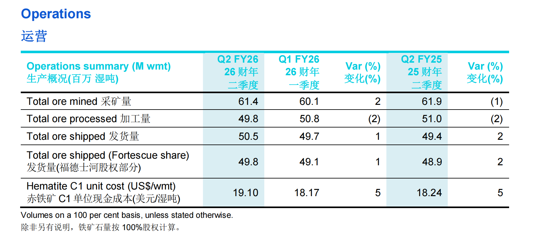 2026 财年上半年 (2025 年 7 月-12 月),福德士河铁矿石发货量达到 1.002 亿吨,同比增长 3%,创下半年发货量历史新高。