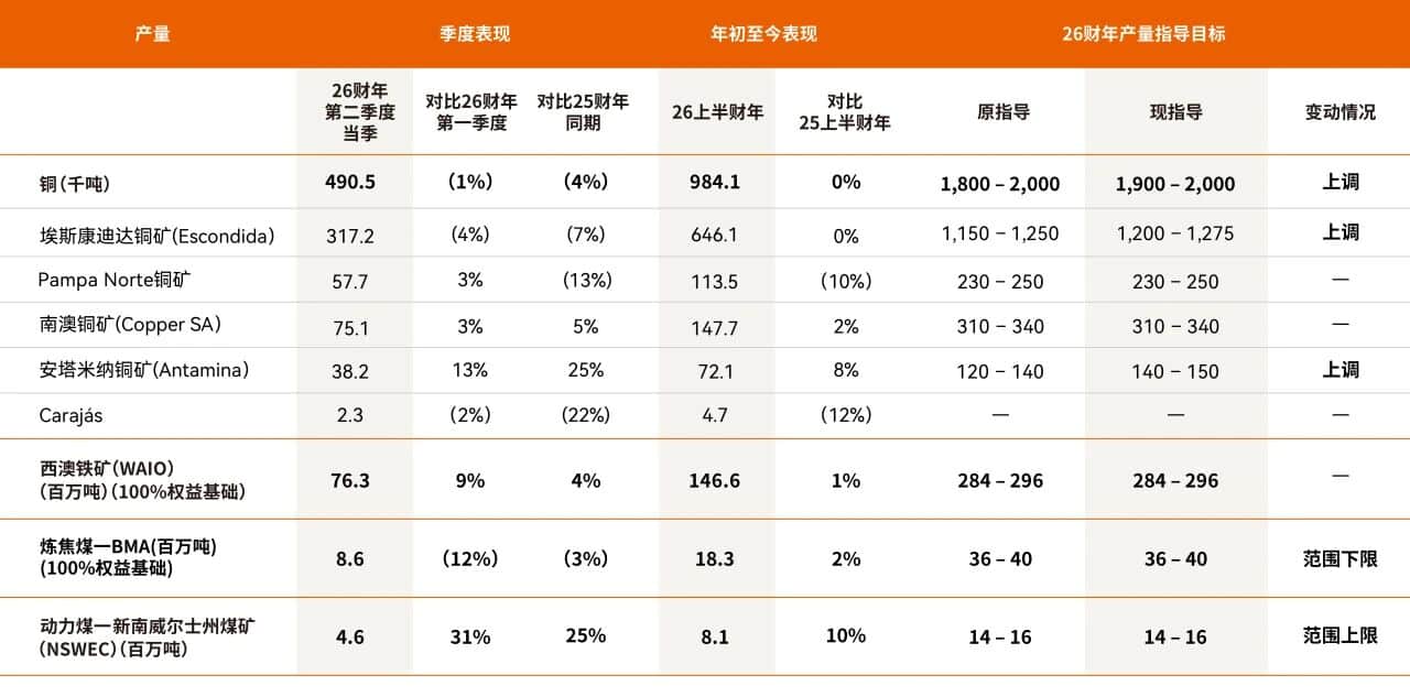 该公司西澳铁矿 (WAIO)2026 上半财年 (2025 年 7 月-12 月) 产量和发运量均创新高。此外,萨马科 (Samarco) 铁矿第二选矿厂于 2025 财年上半年末重启后,进一步带动产量实现增长。