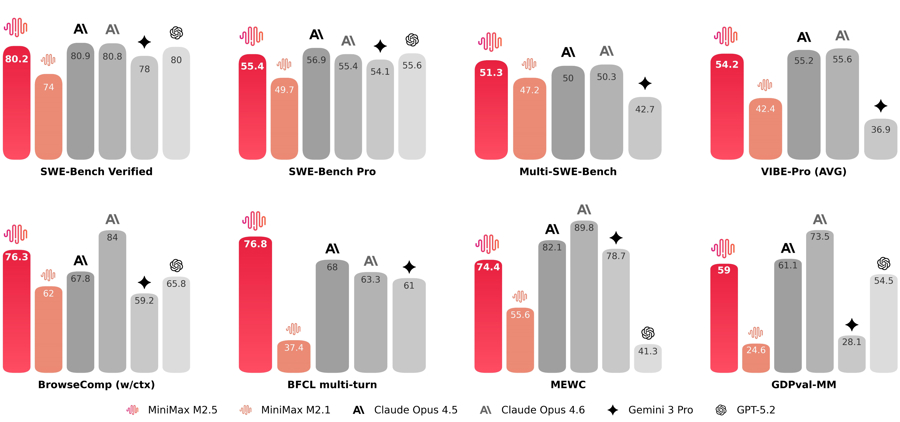 在编程最硬核的 SWE-Bench Verified 榜单上,M2.5 拿到了 80.2% 的高分,与 Claude Opus 4.6 仅有微弱差距。在多语言任务 Multi-SWE-Bench 上,M2.5 超越 Claude Opus 4.6 拿到第一。