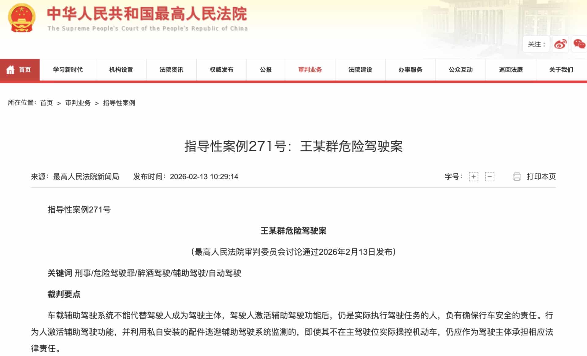 2 月 13 日,最高人民法院发布第 48 批指导性案例 (268–272 号),这是最高法首次发布道路交通安全刑事专题指导性案例。