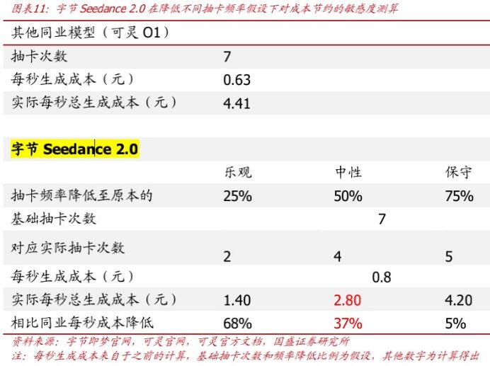 根据国盛证券的测算,假设在 AI 漫剧制作中采用此前的 AI 模型,一个分镜需要生成 7 次才能达到满意效果,以每秒生成成本 0.63 元计算,对应的实际总生成成本约为 4.41 元/秒。虽然 Seedance 2.0 基础定价略高 (约 0.8 元/秒),但如果能将抽卡频率降低至原先的 50%(即 4 次),则实际成本降至 2.8 元/秒,相比普通模型降幅达 37%。如果抽卡频率能降至 25%(即 2 次),成本可降至 1.4 元/秒,降幅高达 68%。