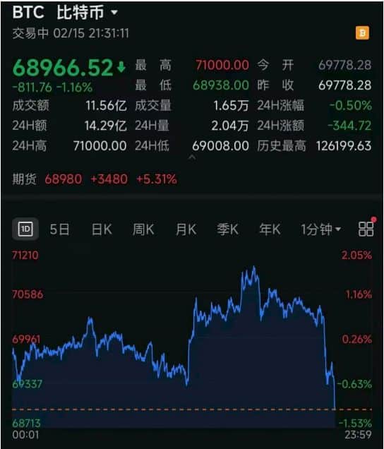 截至 2 月 16 日发稿,比特币报 68894.51 美元,跌幅 1.32%。