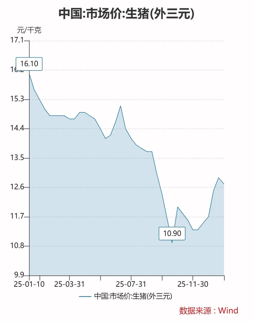与 2024 年相比,2025 年生猪 (外三元) 价格下降约 17%。2025 年全年猪价呈震荡下行态势,价格从年初的 15-16 元/公斤跌至四季度的 11-12 元/公斤,下半年呈现 「旺季不旺」 特征。