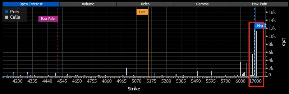 1 月下旬,纽约黄金期货创下每盎司 5600 美元以上的历史新高,然而次日便遭遇前所未有的暴跌。就在此时,一名或一群投资者开始在芝加哥商品交易所集团 (CME Group) 的纽约商品交易所 (Comex) 买入 12 月到期、执行价为 15000 美元/20000 美元的看涨期权价差合约。即便在金价企稳于 5000 美元/盎司左右后,这一持仓仍在持续增加,目前已增至约 1.1 万张合约。