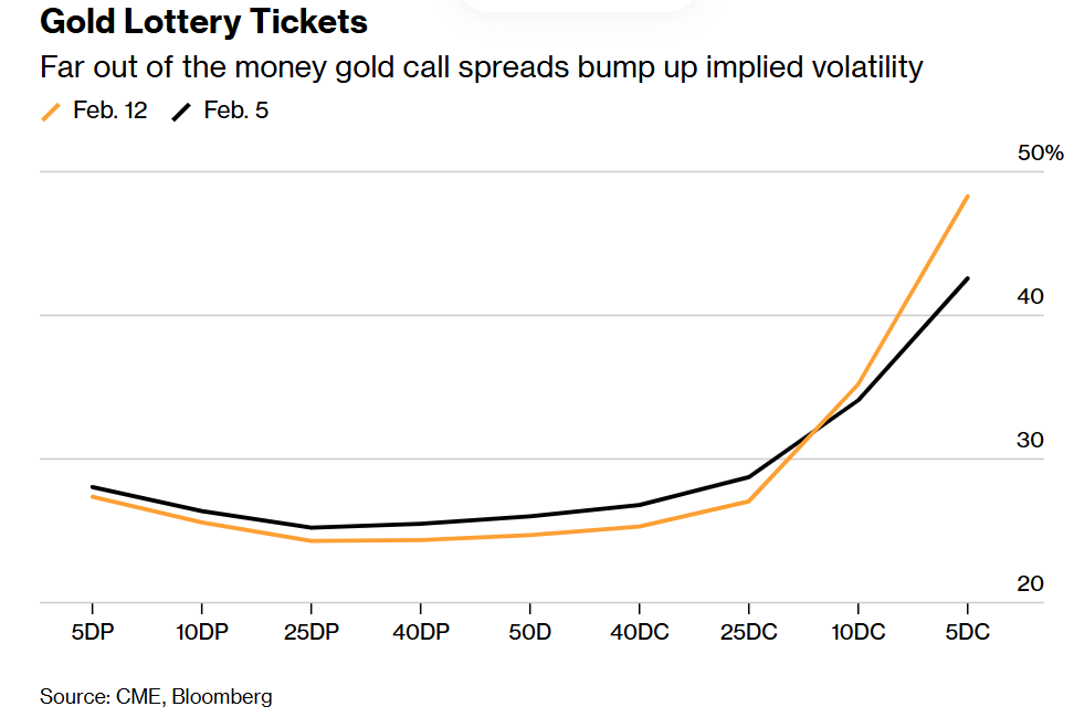 尽管目前金价仍远未达到能让这些合约发挥作用的水平,但上周这些交易推高了远期看涨期权的隐含波动率,而其他大多数期权的价格则相对走低。