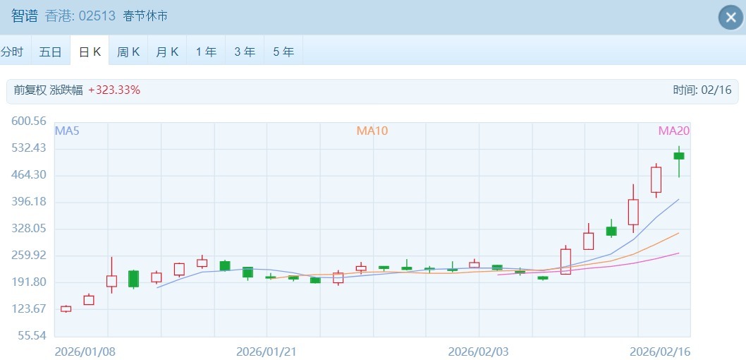 个股层面,AI 概念股中,智谱作为 「国产大模型第一股」,早盘高开,尽管随后涨幅收窄,但其 2 月以来股价累计上涨 1.2 倍,总市值超 2200 亿港元,成为科技板块目前市场最大的亮点。