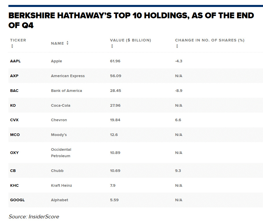 据数据平台 Whalewisdom 统计,与去年第三季度末相比,伯克希尔 Q4 增持了 4 个标的,减持 9 个标的,新进 1 个标的。