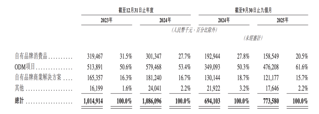 2025 年前三季度,公司 ODM 业务收入为 4.76 亿元,占总收入比例从 2023 年的 50.6% 攀升至 61.6%,成为绝对的收入支柱。
