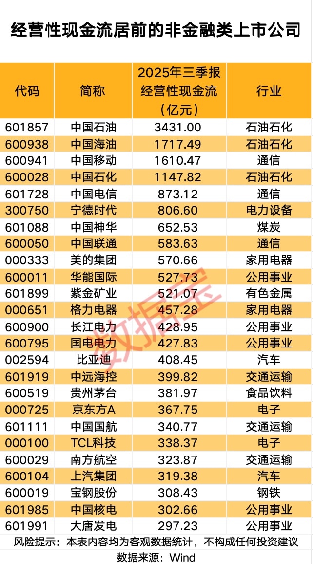统计显示,63 家上市公司 2025 年前三季度经营性现金流超过 100 亿元,其中中国石油、中国海油、中国移动、中国石化居前,均超过 1000 亿元。从行业来看,经营性现金流超百亿元公司集中在公用事业(主要包括电力细分行业)、石油石化、交通运输、汽车行业。