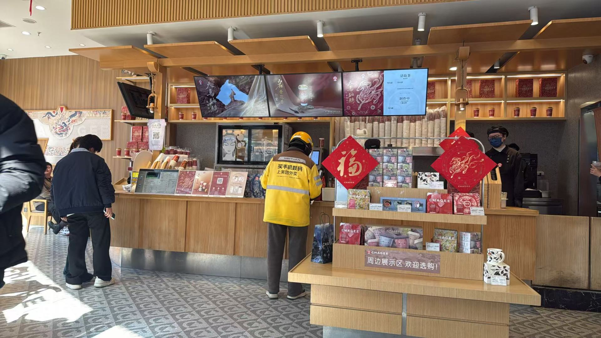 春节假期,霸王茶姬门店外卖小哥在取单