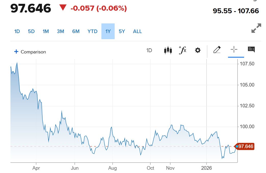 美元指数最近一年的表现 (截至 2 月 19 日 16:12,美元指数为 97.646)
