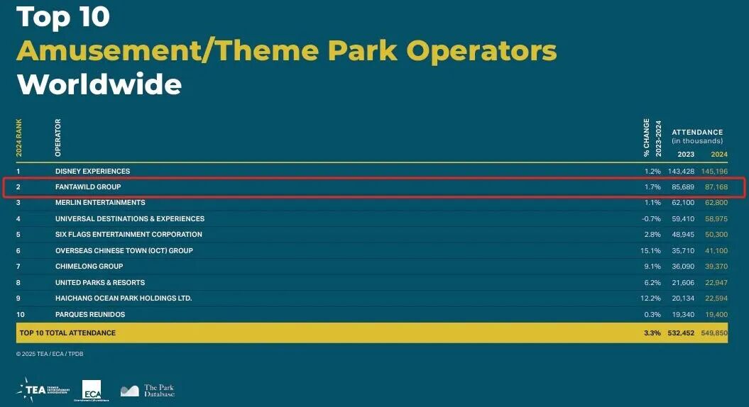 据 TEA 数据,2024-2025 年,华强方特主题乐园的游客接待量,均位居全球第二,仅次于迪士尼。