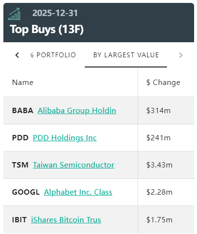 阿里巴巴 (BABA) 作为第二大重仓股,也获得显著加仓,持股数量由三季度末的 328.9 万股增至 543 万股,持仓市值由 5.88 亿美元升至 7.96 亿美元,在投资组合中的占比从 14.4% 大幅提升至 26%,巩固了核心持仓地位。