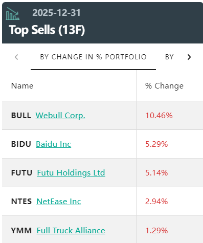 此外,百度(BIDU)、网易(NTES)、满帮(YMM)、冬海集团 (SE)、博实乐 (BEDU) 等标的被清仓。