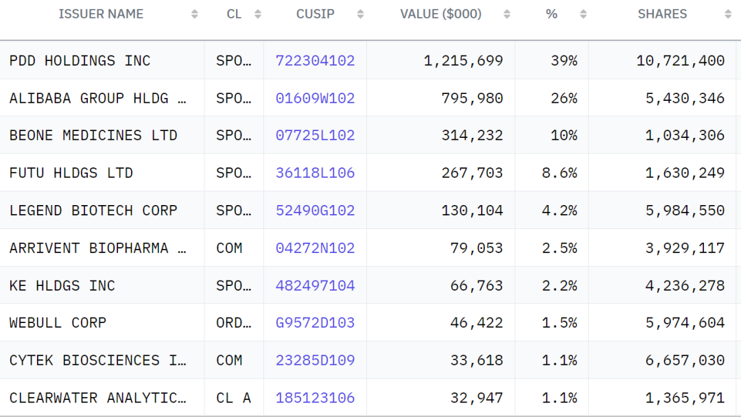 具体来看,HHLR Advisors 前十大重仓股分别为拼多多、阿里巴巴、百济神州、富途控股、传奇生物、ARRIVENT BIOPHARMA INC、贝壳、WEBULL CORP、CYTEK BIOSCIENCES INC 和 CLEARWATER ANALYTICS HLDGS I。