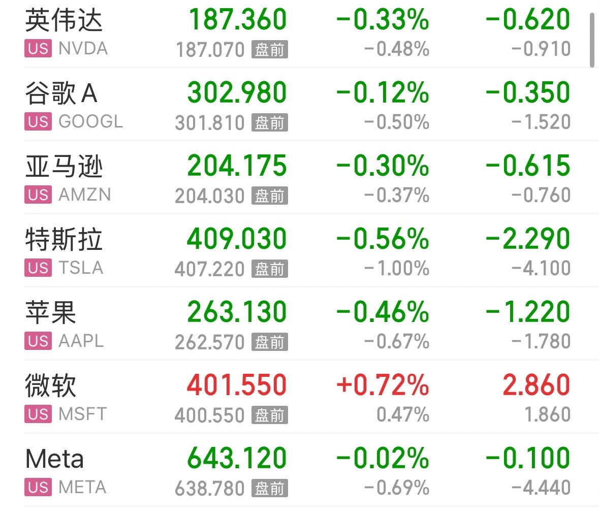 大型科技股多数下跌,英伟达、谷歌、亚马逊、特斯拉、苹果、Meta 微跌,微软上涨 0.72%。