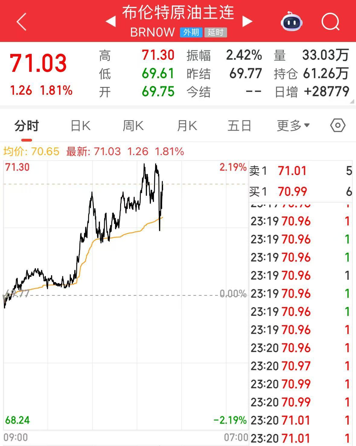 地缘紧张局势升温,油价冲高后企稳。截至发稿前,布油、美油均涨超 1%。