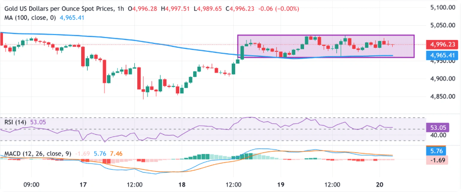 Fxstreet 分析师指出,周四,黄金守住了 100 小时简单移动平均线 (SMA),并从该均线反弹。不过,过去两天左右缺乏持续的买盘以及区间波动的价格走势,令看涨的交易员需保持谨慎。目前,该均线位于 4965.41 美元,为价格提供了附近的动态支撑。