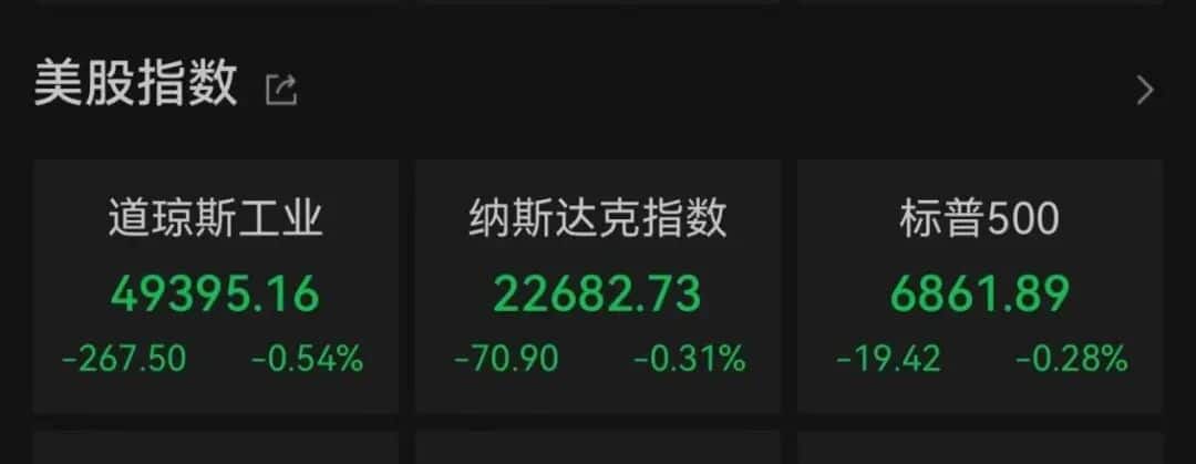 截至收盘,道琼斯指数下跌 0.54%,报 49395.16 点;标普 500 指数下跌 0.28%,报 6861.89 点;纳斯达克综合指数下跌 0.31%,报 22682.73 点。