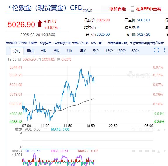 现货黄金同步上攻,截至发稿报 5026.90 美元/盎司,涨幅 0.62%。