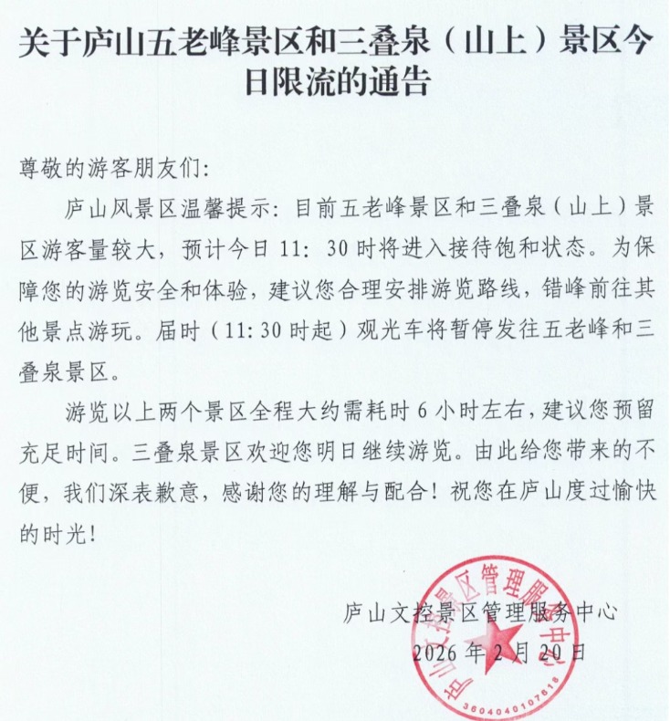 庐山核心景区 (山上) 预约已满,启动限流措施,五老峰景区和三叠泉 (山上) 景区观光车暂停。