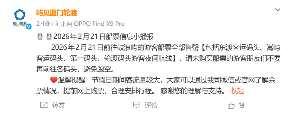 厦门轮渡通知称,2 月 21 日前往鼓浪屿的游客船票全部售罄 (包括东渡客运码头、嵩屿客运码头、第一码头、轮渡码头游客夜间航线),请未购买船票的游客朋友们不要再前往各码头,避免跑空。