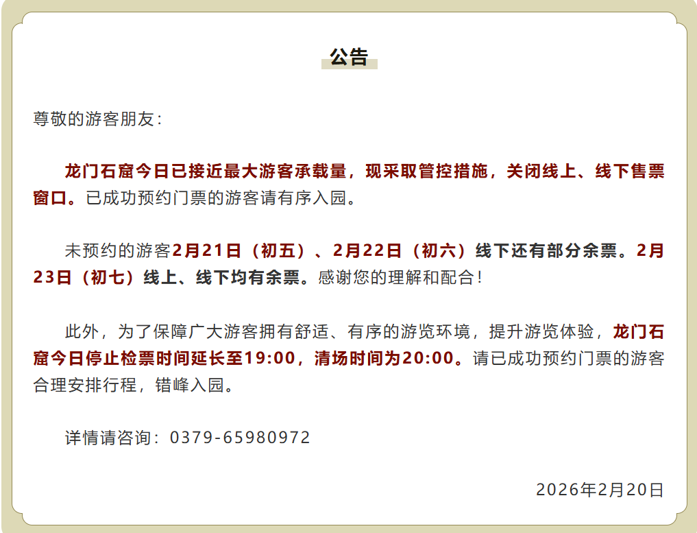 龙门石窟 2 月 20 日公告称,今日已接近最大游客承载量,现采取管控措施,关闭线上、线下售票窗口。龙门石窟今日停止检票时间延长至 19:00,清场时间为 20:00。