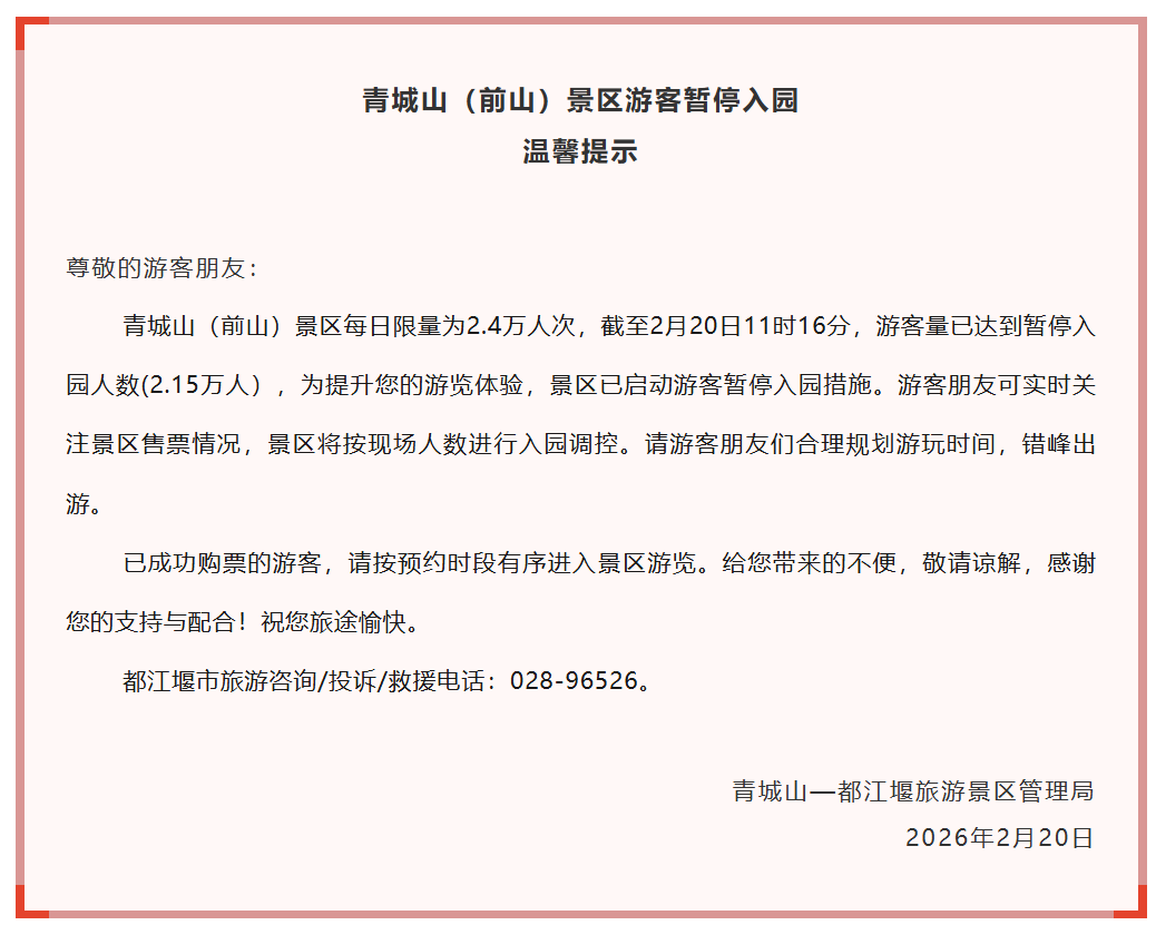 青城山 (前山) 景区公告称,截至 2 月 20 日 11 时 16 分,游客量已达到暂停入园人数 (2.15 万人),景区已启动游客暂停入园措施。