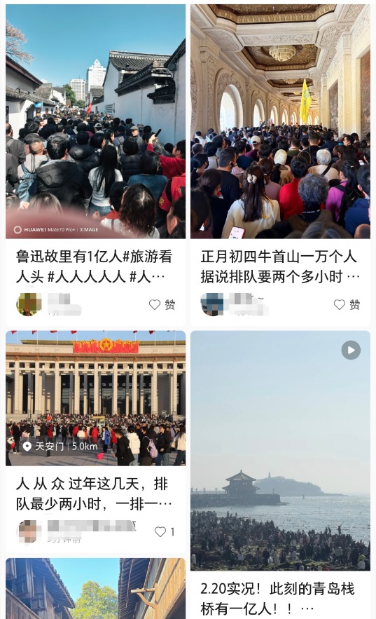 近期,大量网友在社交平台上发帖,展示假期出游时遭遇的 「人山人海」。