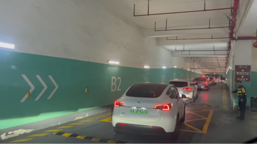 同一时间,位于海口新海港的 cdf 海口国际免税城车库入口处已排起百米长队,车辆在工作人员的引导下依次驶入车库。