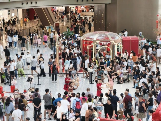 cdf 三亚国际免税城内,市民游客在观看舞蹈表演。记者黎灵希摄