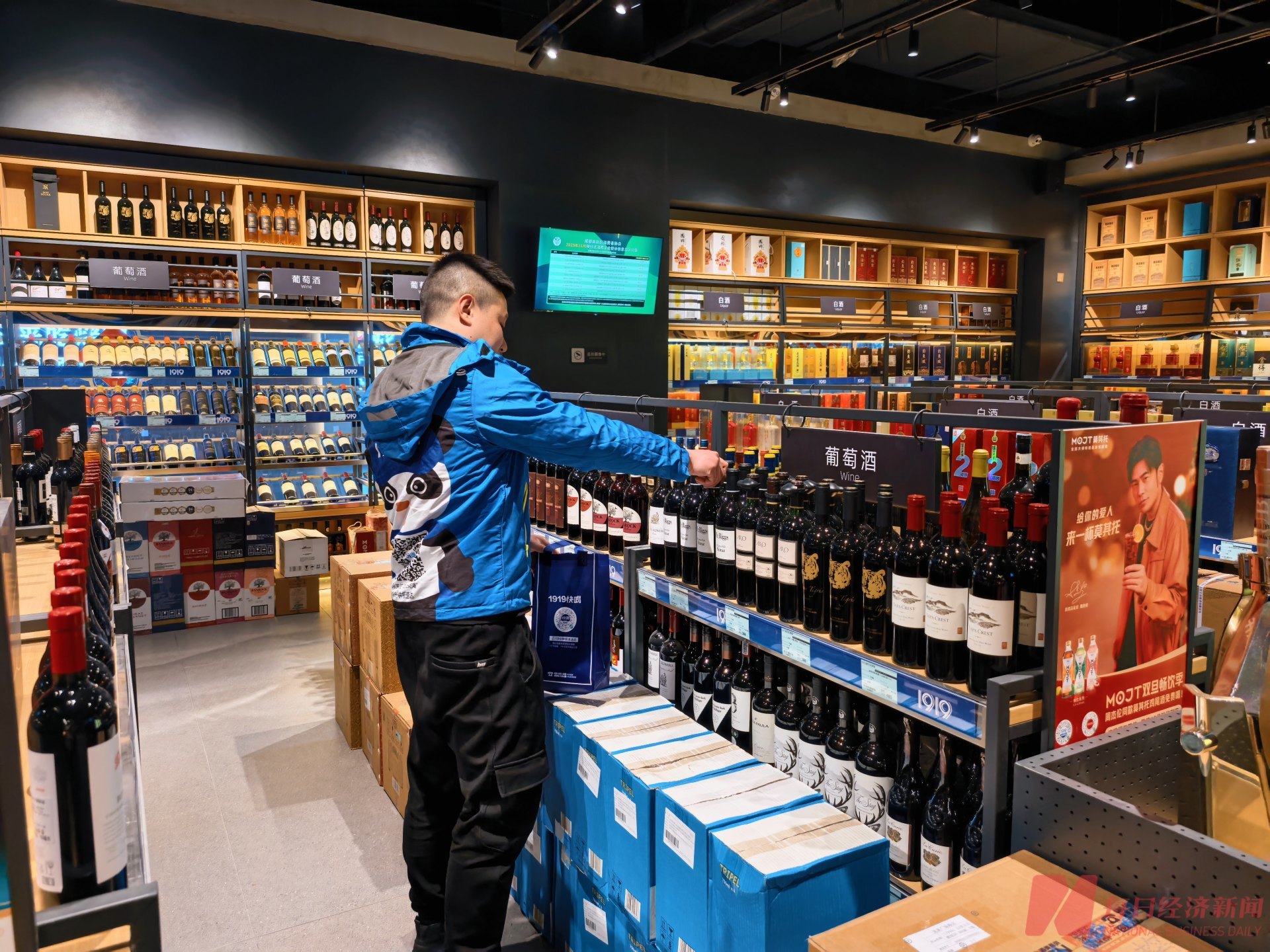 春节期间,位于成都城南的 1919 酒饮生活馆旗舰店照常营业。身着工作服的小金正忙碌地对照着货单,快速地将顾客需要的酒水包装好,再骑上电动车,马不停蹄地给客户配送上门。