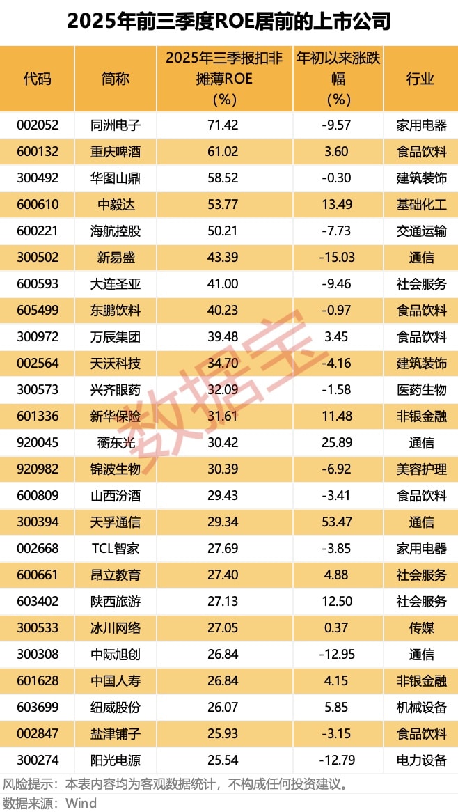 据证券时报·数据宝统计,2025 年前三季度,A 股上市公司扣非摊薄 ROE 超过 20% 的共有 53 家,其中食品饮料行业最多,共有 7 家入围;其次是通信、社会服务行业,分别有 6 家、5 家入围。