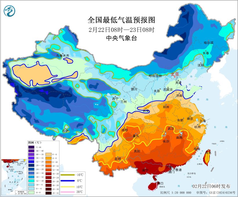 中央气象台2 月 22 日 06 时继续发布寒潮蓝色预警: